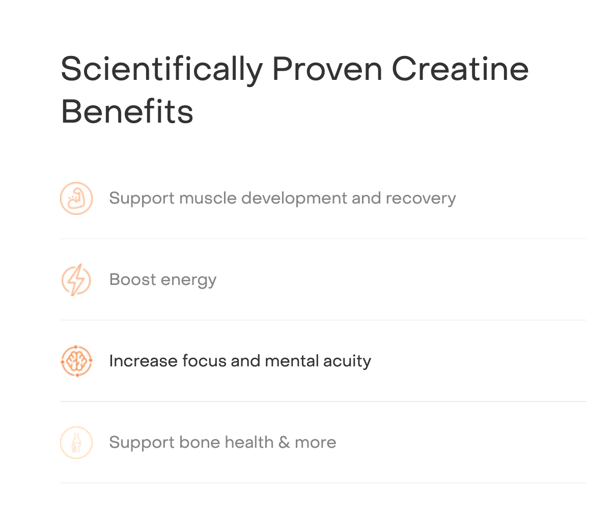 You could make an even sharper scalpel and make a single ingredient product, and we see this with the relatively new creatine brand Create. They are all-in on creatine, and as a result their marketing is tightly focused on the benefits of just creatine. But they’re able to go deep, and talk about creatine as a workout product, creatine for the brain, creatine for bone health: